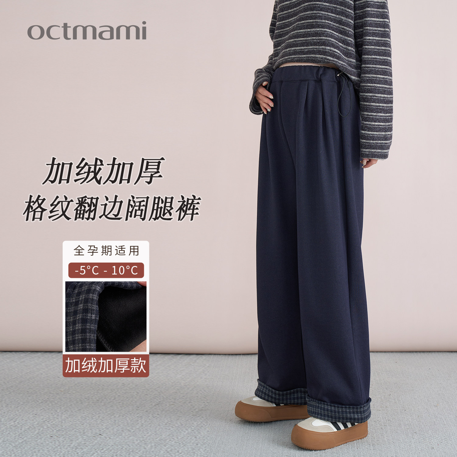 十月妈咪孕妇阔腿裤2025新款冬季外穿加绒加厚脚口格纹翻边休闲裤