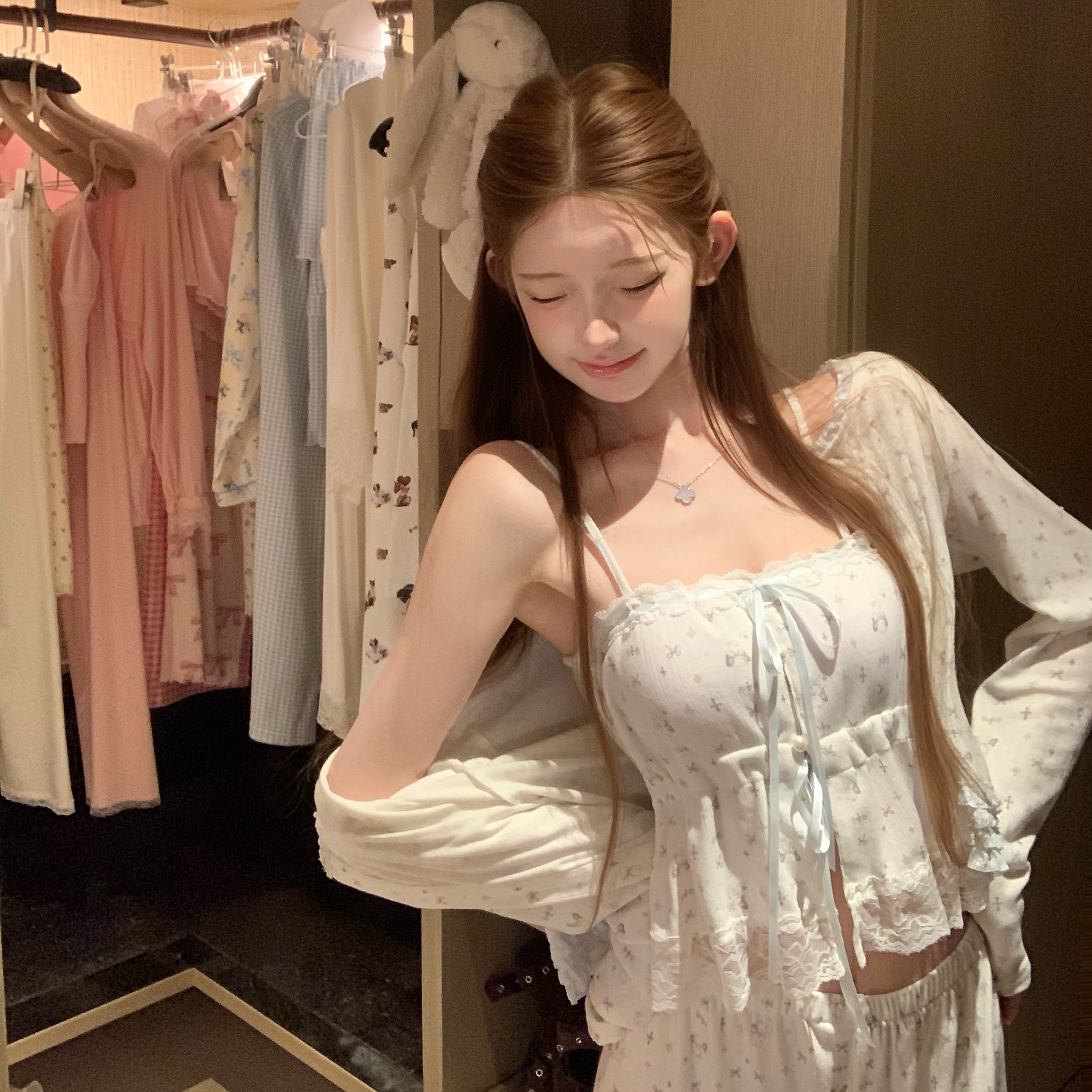 欧若拉睡衣女2026纯欲风美少女绝美【A类贴身】针织三件套带胸垫
