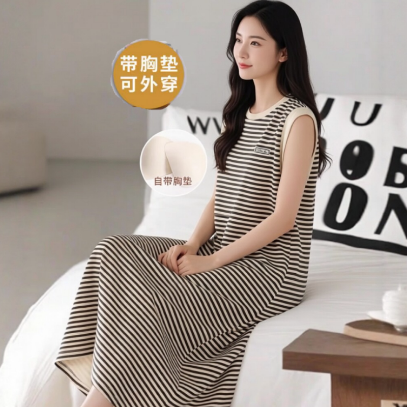 睡裙女士夏季无袖背心带胸垫条纹中长家居服可外穿坎肩慵懒风睡衣