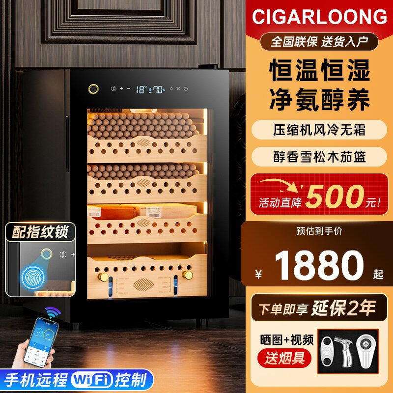茄龙60C雪茄柜智能WiFi恒温恒湿雪茄压缩机天然雪松木净氨雪茄柜