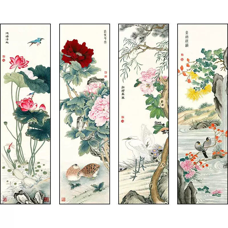 梅兰竹菊四条屏中式国风竖版古典客厅装饰画春夏秋冬四联现代挂画