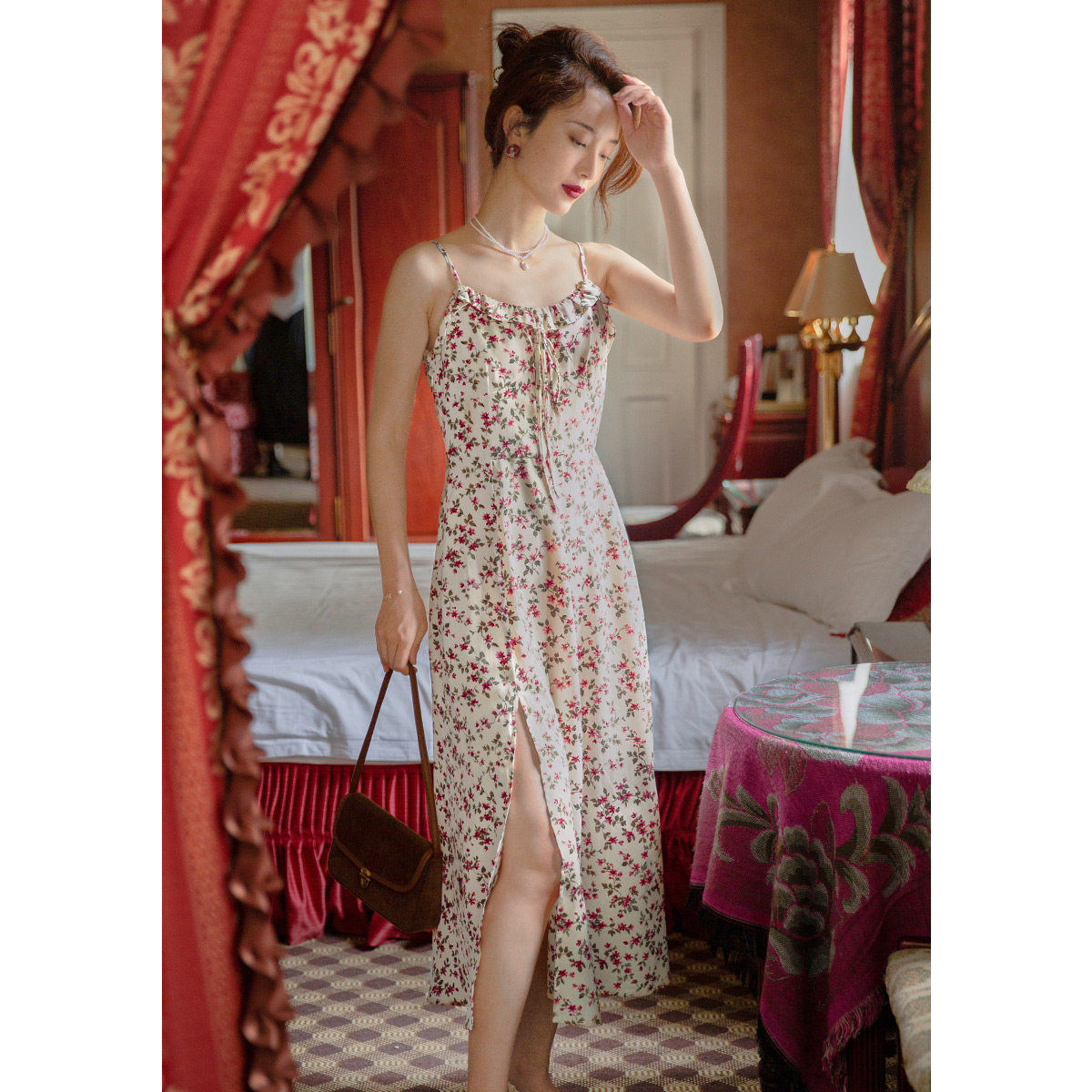 弥古法式雪纺碎花吊带连衣裙女设计感小众复古开叉长裙内搭打底裙