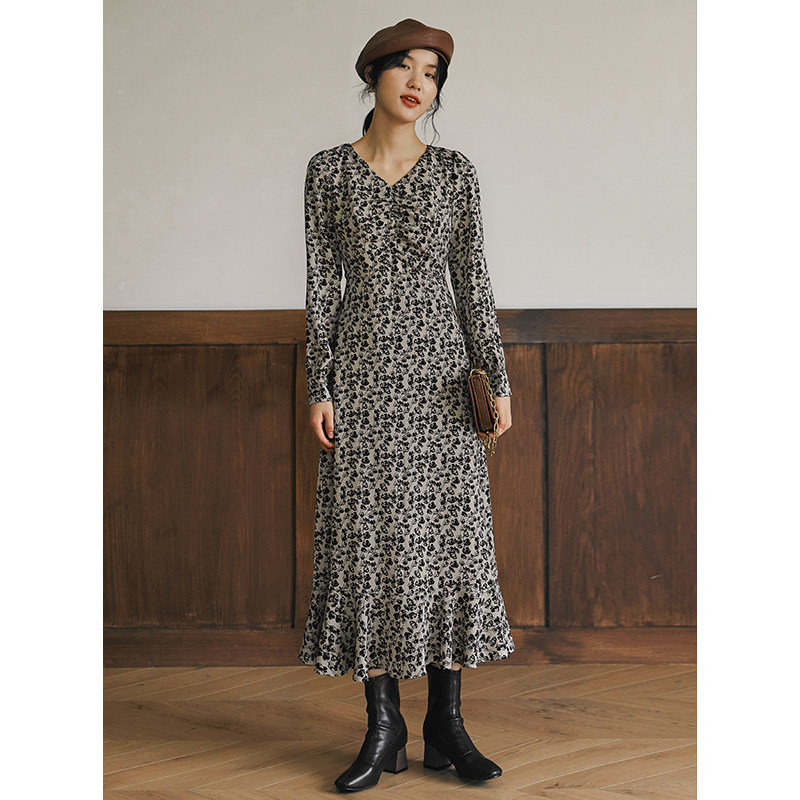 弥古长袖雪纺连衣裙女高级感法式复古碎花裙秋冬内搭收腰打底长裙