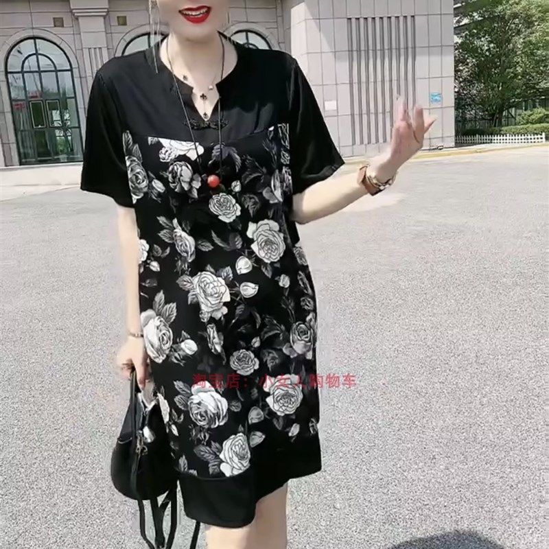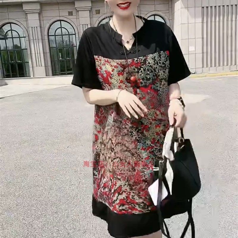 夏装复古盘扣黑色拼接碎花短袖宽松雪纺连衣裙女中长版妈妈打底裙