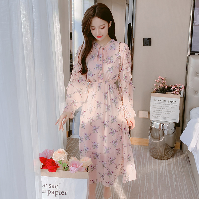 韩版长袖碎花复古印花雪纺连衣裙2024新款百搭洋气打底荷叶边裙子