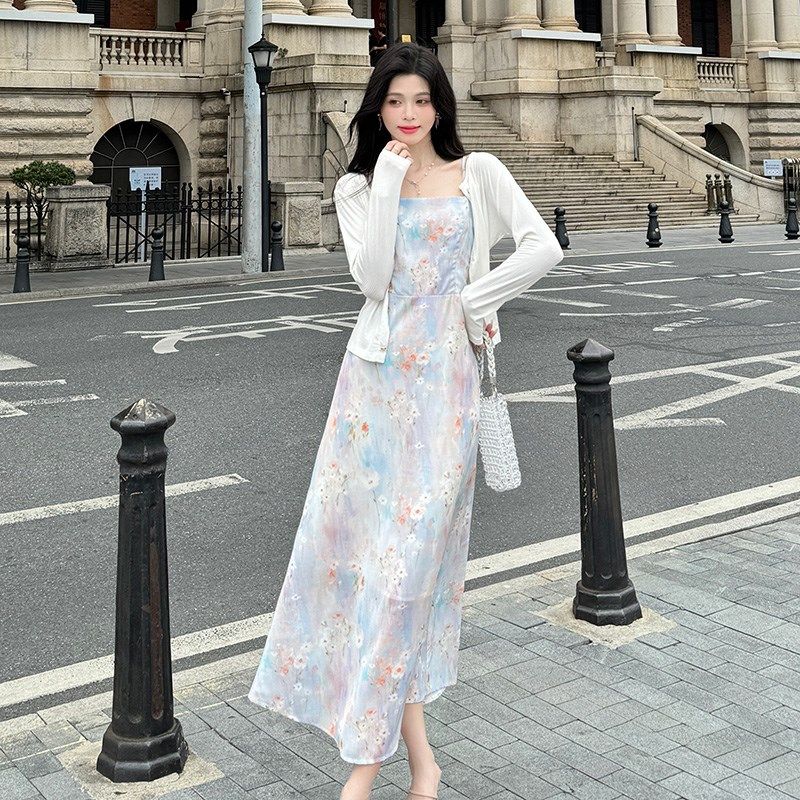 茶歇裙法式碎花吊带裙女2024春夏季清纯甜美雪纺连衣裙打底长裙子