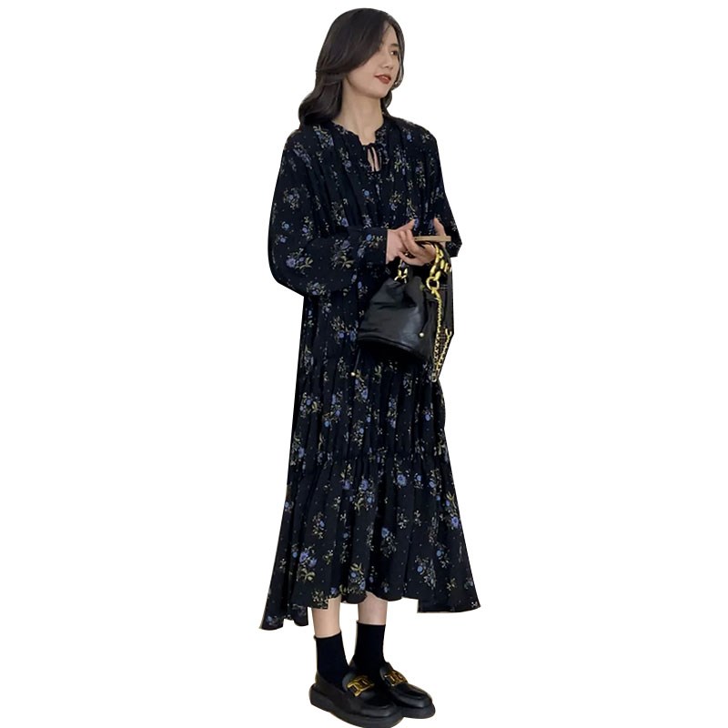 法式复古黑色碎花连衣裙女秋冬收腰显瘦长袖打底气质雪纺长裙a225