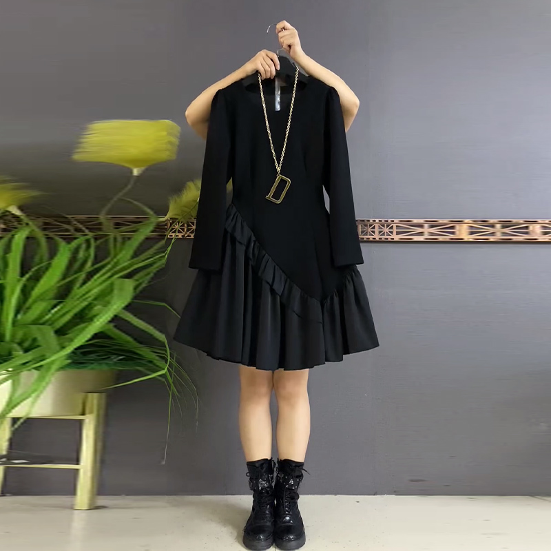 加大码女装圆领斜拼飞边摆连衣裙胖妹妹秋季款中长款简约显瘦裙子