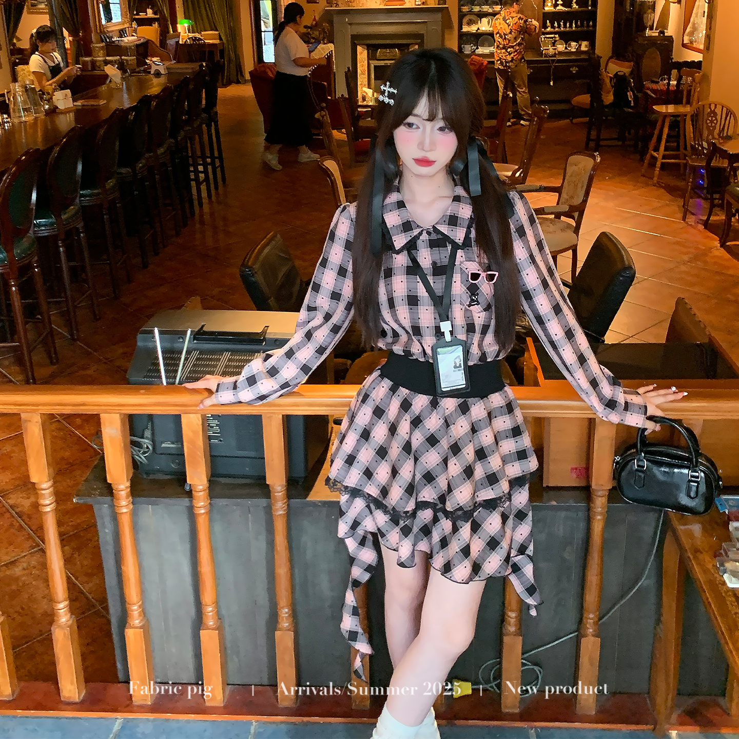 织物猪 黑桃序约 甜酷风格子衬衫连衣裙女早秋收腰长袖不规则短裙