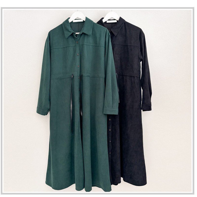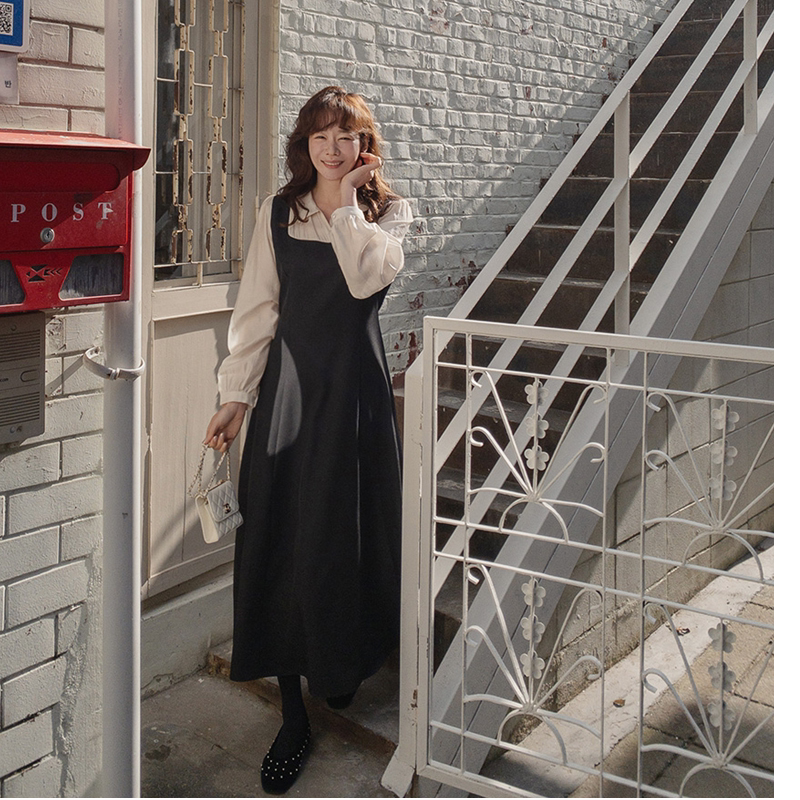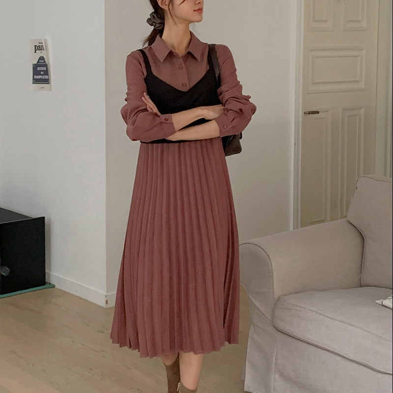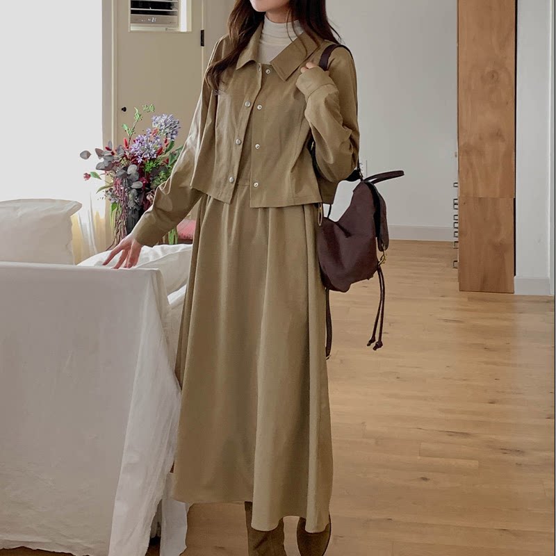 韩国代购大码女装2025靓丽冬装新款翻领系扣连衣裙+吊带两件套特