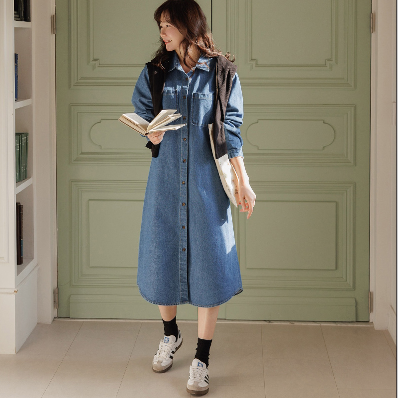 韩国代购大码女装2026靓丽冬装新款翻领系扣宽松拼接牛仔连衣裙特