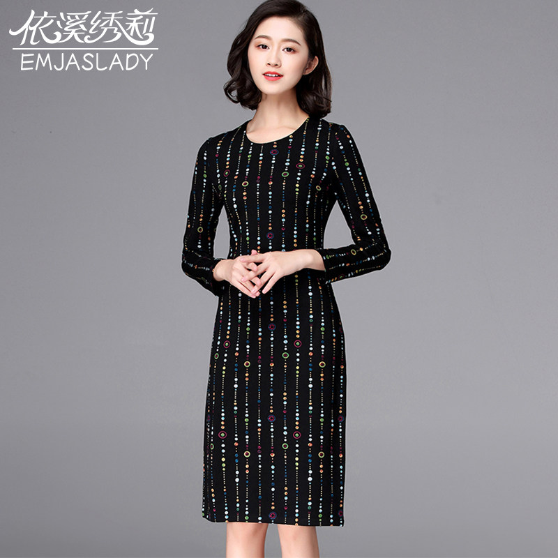 2023秋冬装新款女装大码淑女中老年妈妈装长袖印花修身过膝连衣裙