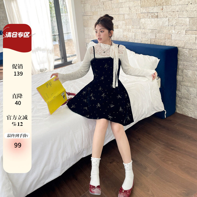 大码女装胖mm韩系绝美小套装秋冬装独特漂亮蕾丝打底连衣裙两件套