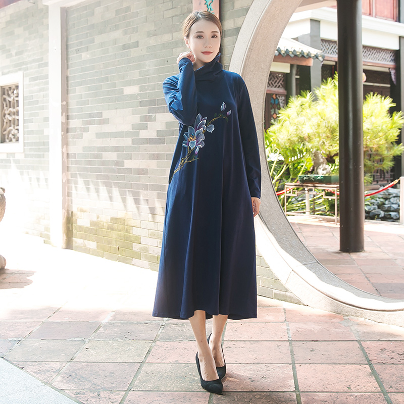 依晓桐大码女装胖mm秋冬装新款打底连衣裙手绘民族风加肥宽松长裙