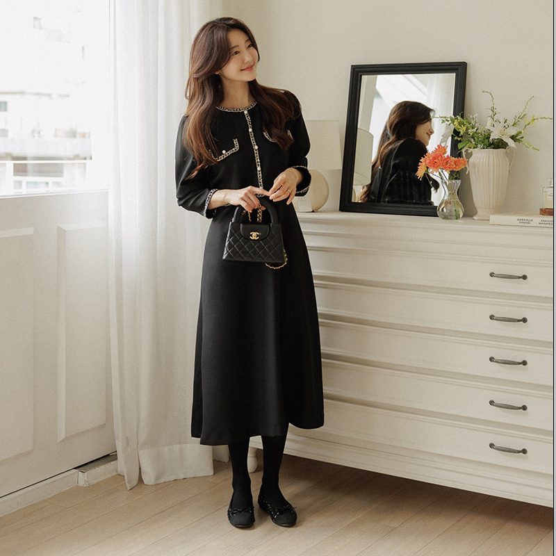 韩国代购大码女装2025靓丽冬装新款圆领系扣开衫内搭连衣裙两件套