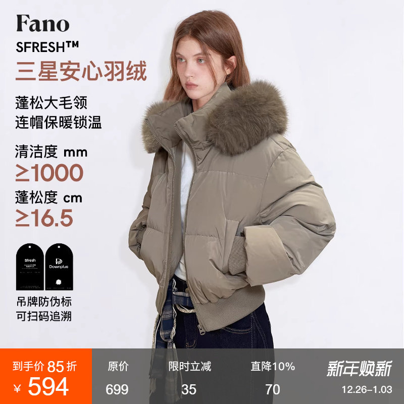 范洛Fano 造型感穿搭冬季时髦出街灰调短款连帽毛领羽绒服外套女