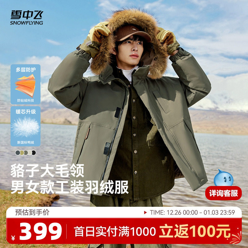 雪中飞2025冬新款男女情侣短款羽绒服貉子毛领派克纯色户外时尚