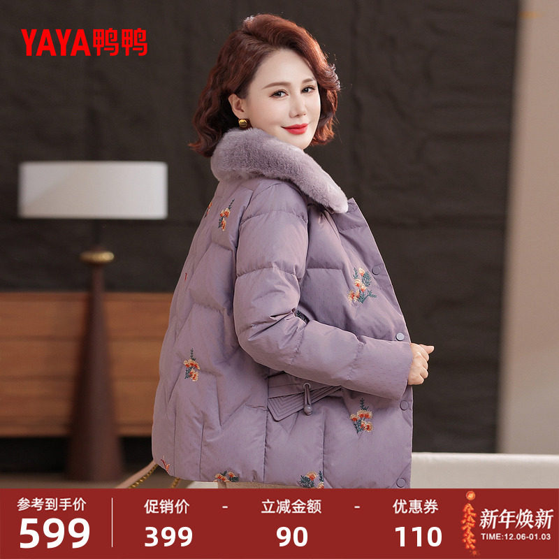 鸭鸭羽绒服女款2025年冬季新品中老年兔毛领妈妈装短款简约外套Y