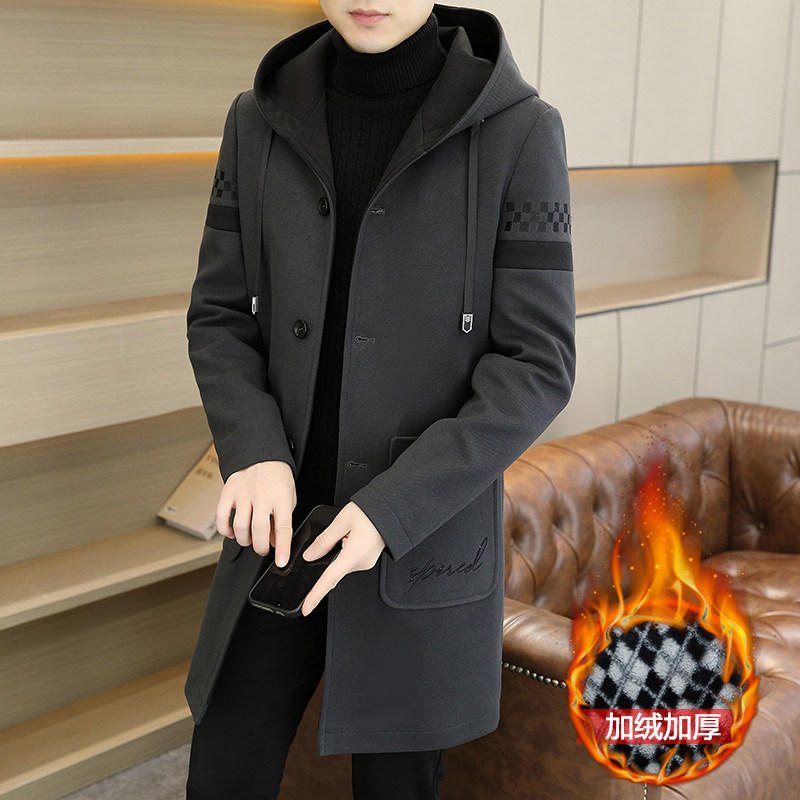 外套男加绒加厚学生夹克连帽修身中长款风衣男帅气百搭冬季棉衣服