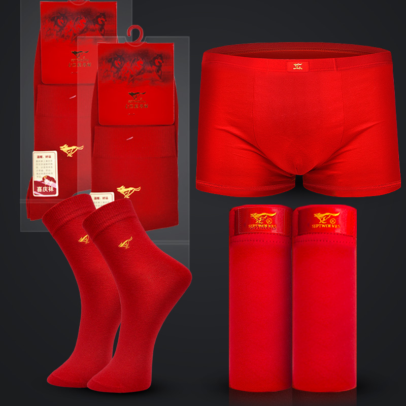 七匹狼大红内裤头男士平角本命年纯棉四角裤土结婚用一两条装短裤