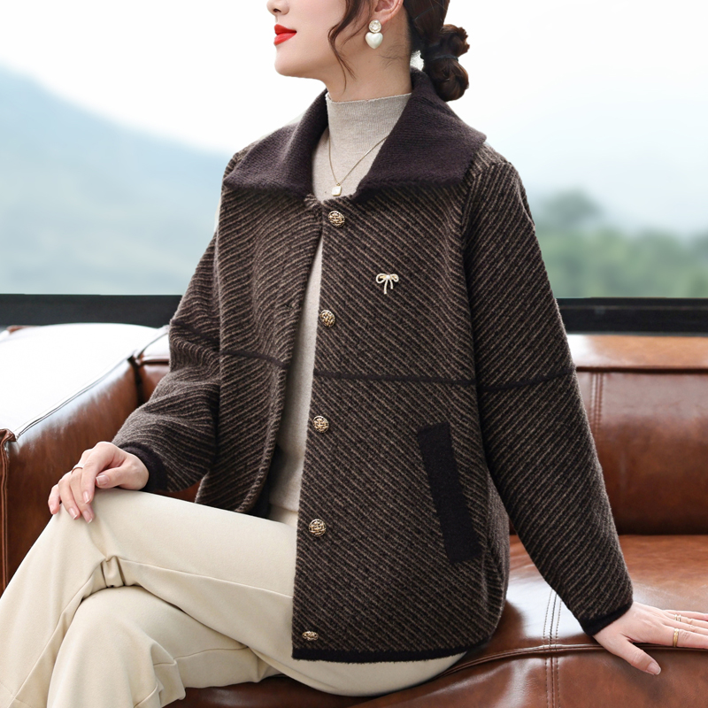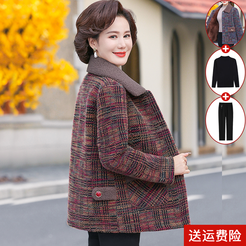 妈妈秋冬仿水貂绒短外套新款大格子减龄洋气中老年人女毛呢短外套