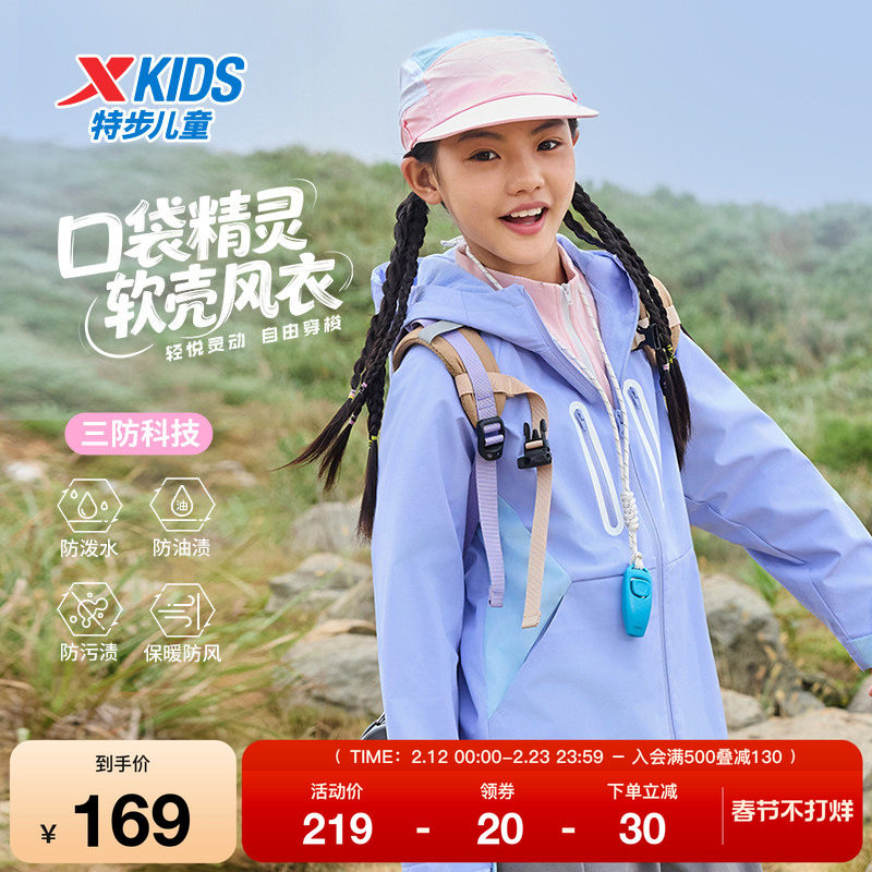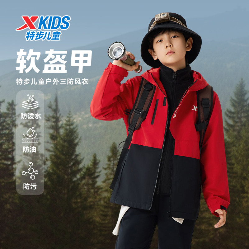 特步童装春秋季学生外套户外休闲男童儿童中大童连帽撞色拼接风衣