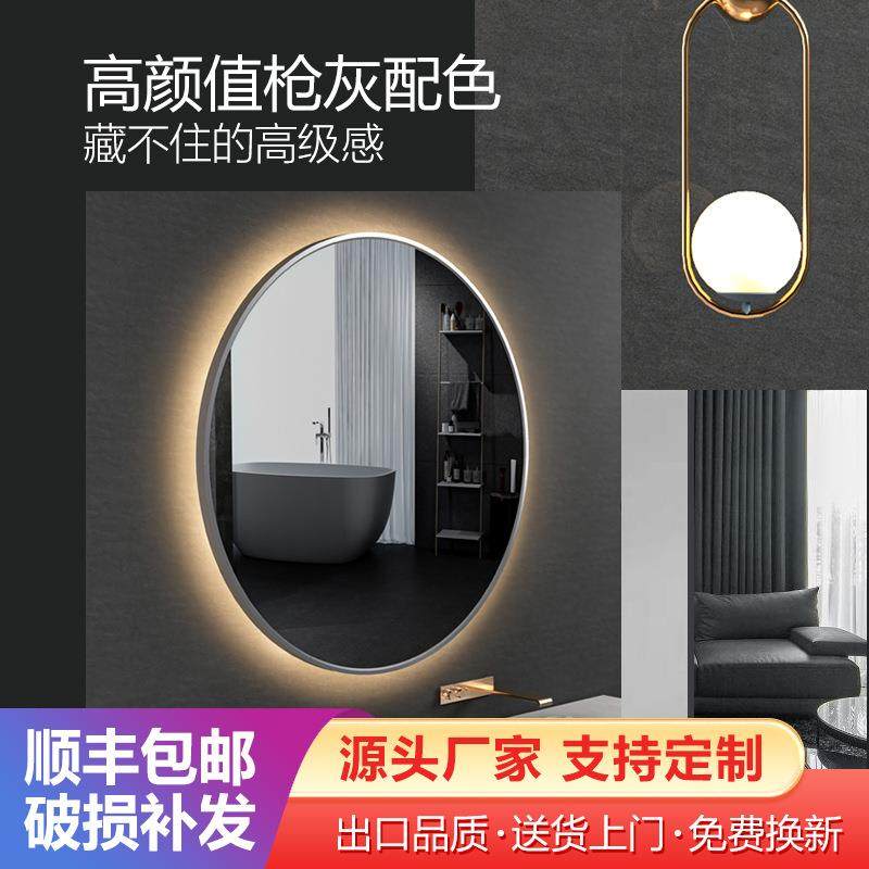 枪灰色边框浴室镜led灯发光智能免打孔圆形酒店防雾触摸屏壁挂