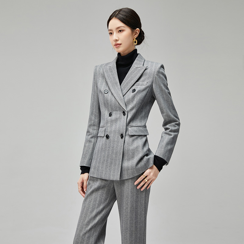 时尚灰条纹双排扣西装外套女MOFAN摩凡2025秋冬显瘦休闲西服套装