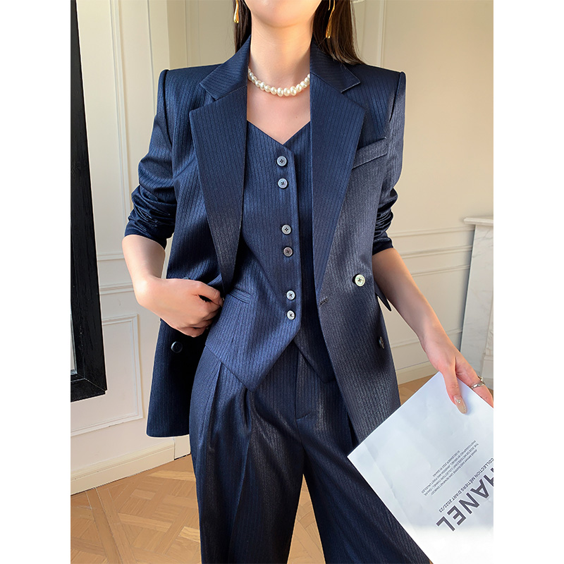 诗璐雅藏青色条纹西装女套装时尚气质正装经理职场上班工作服冬季