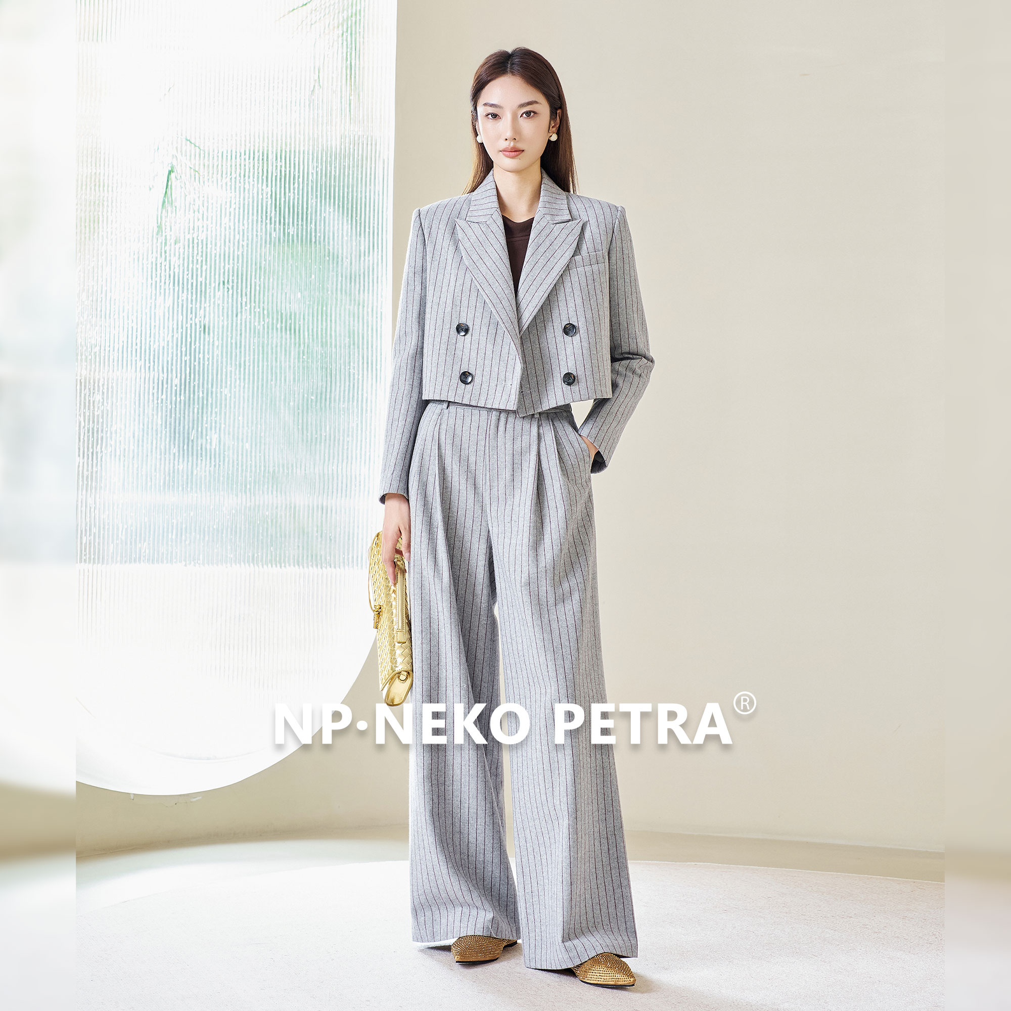Neko Petra高级感时尚短款灰色羊毛条纹西装套装女秋阔腿裤两件套