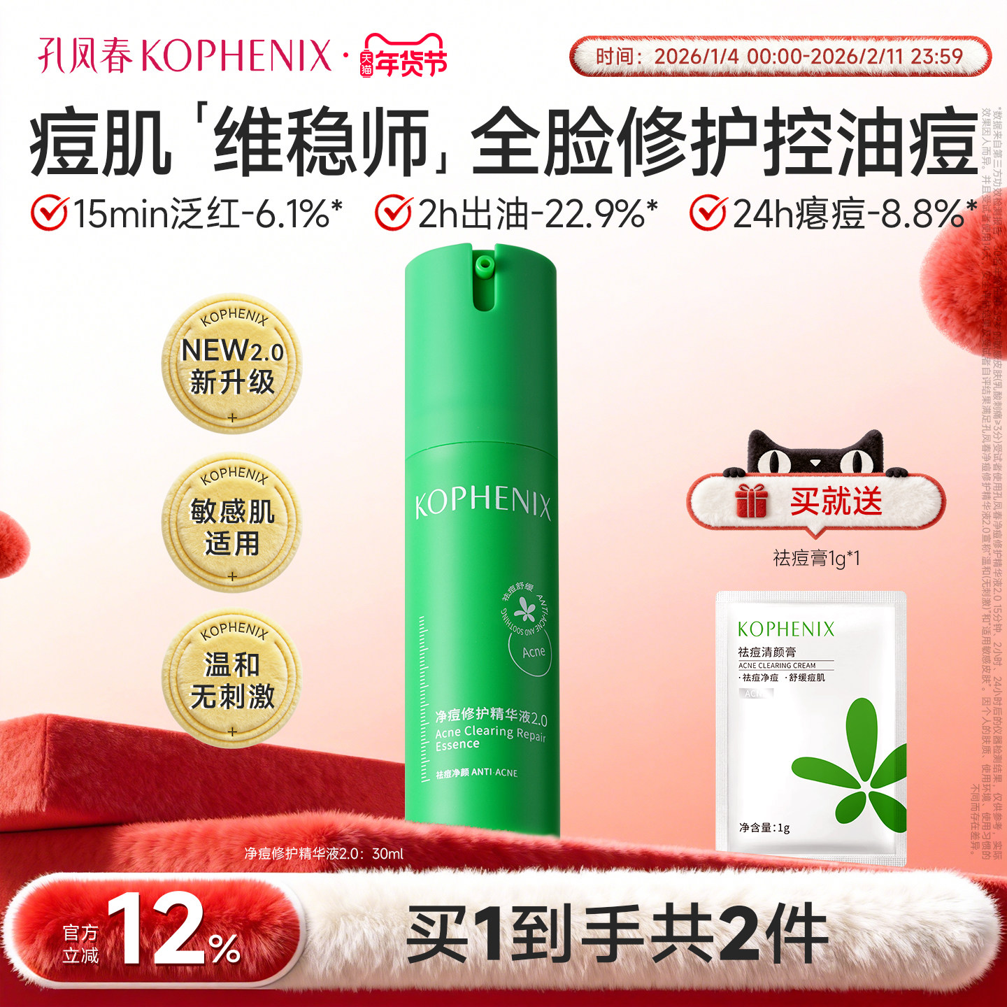 孔凤春马齿苋祛痘精华液脸部青春痘粉刺闭口红痘温和修护净颜痘肌