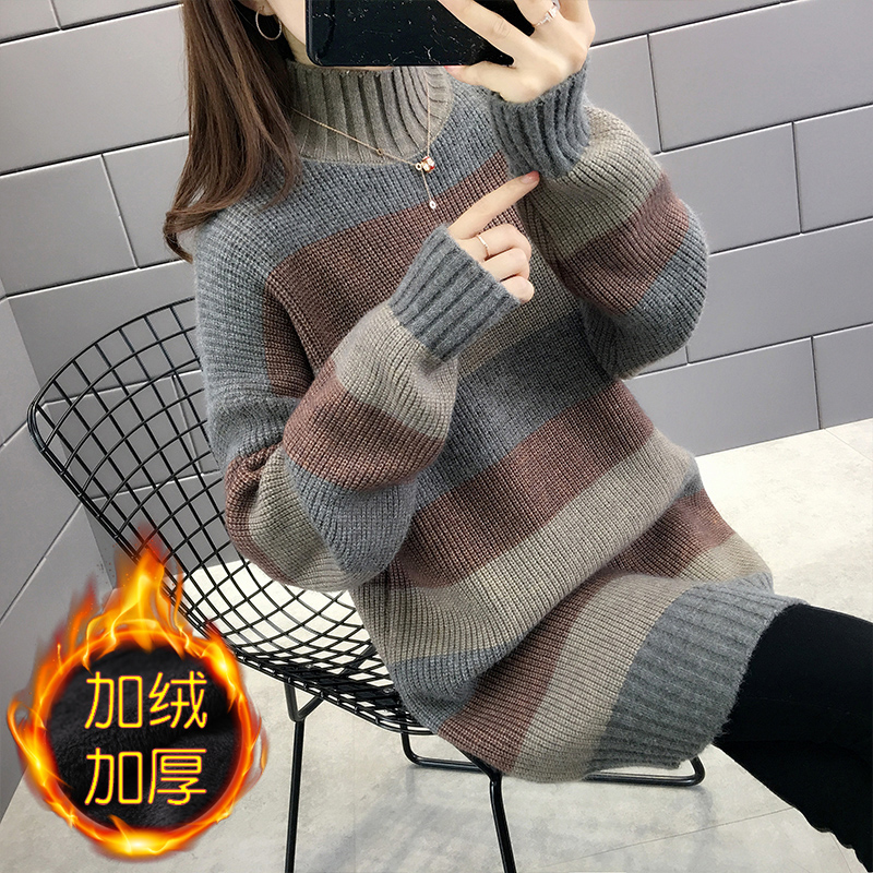 中长款条纹毛衣女秋冬宽松2025年新款加绒加厚半高领遮屁股毛衣裙