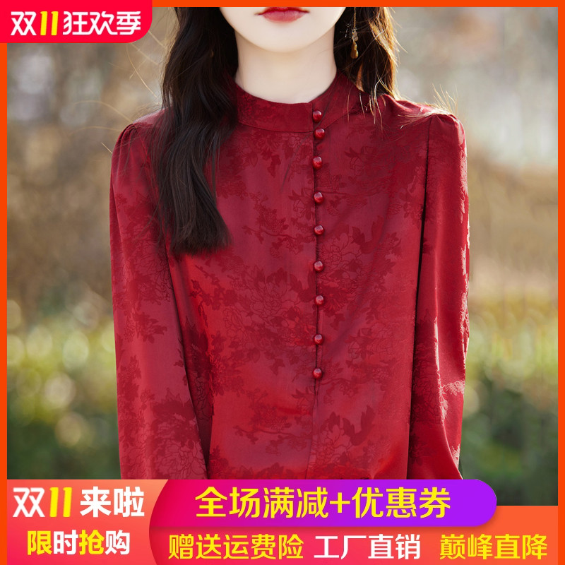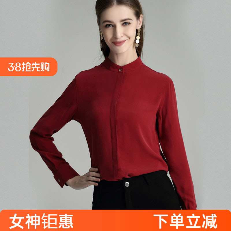 酒红色重磅真丝立领衬衫女长袖2024新款春桑蚕丝上衣欧美时尚绸缎