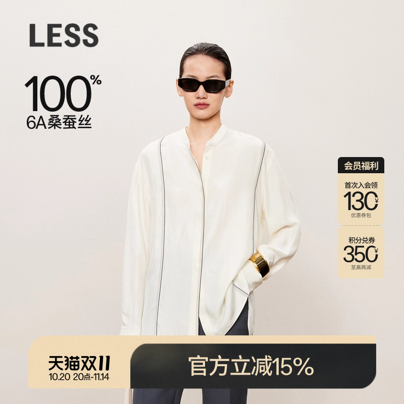 LESS春秋桑蚕真丝立领衬衫女条纹撞色休闲垂感长袖衬衣2O8214710