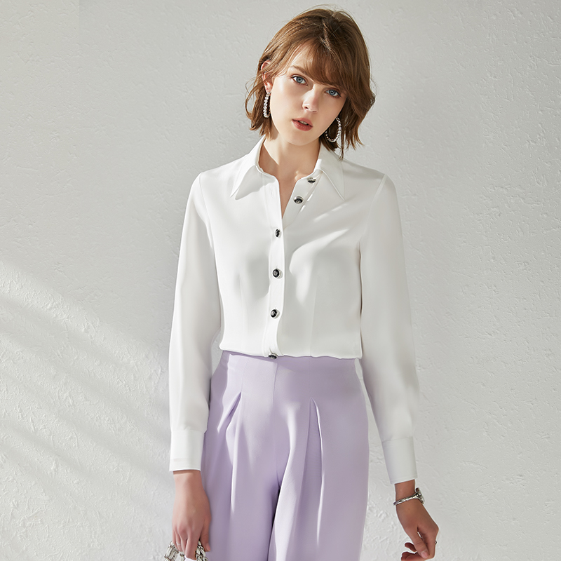 丝艺 100%桑蚕丝缎面立领真丝长袖白色衬衫女素绉缎衬衣早秋上衣