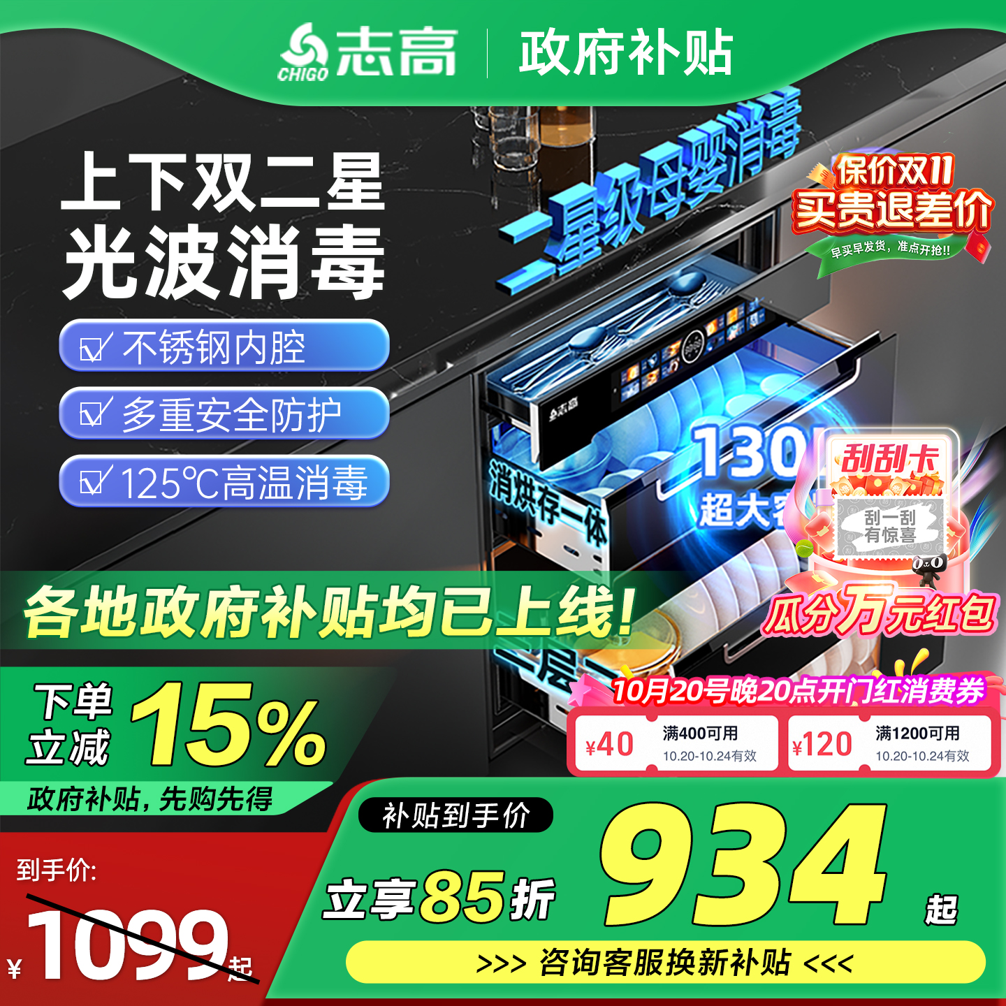 [政府补贴15%]志高嵌入式消毒柜家用厨房不锈钢120L高温消毒碗柜