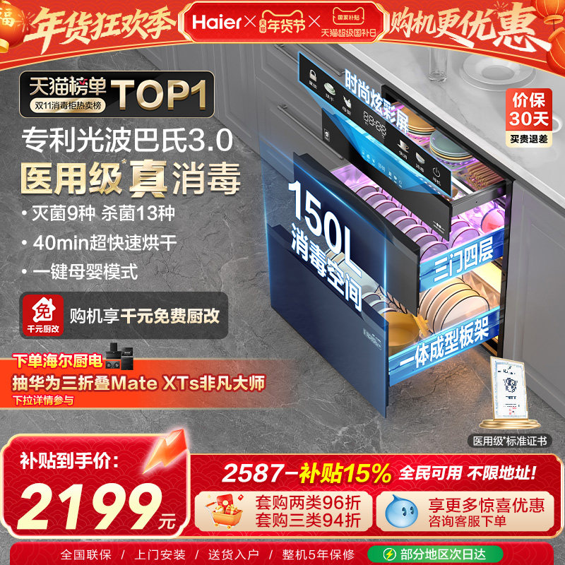 [热销]海尔医用级灭菌舱150L消毒柜家用嵌入式碗柜碗筷烘干EB150