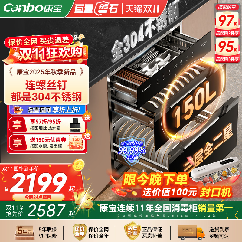 康宝巨量150L嵌入式消毒柜家用全304不锈钢碗柜筷烘干2025年新款