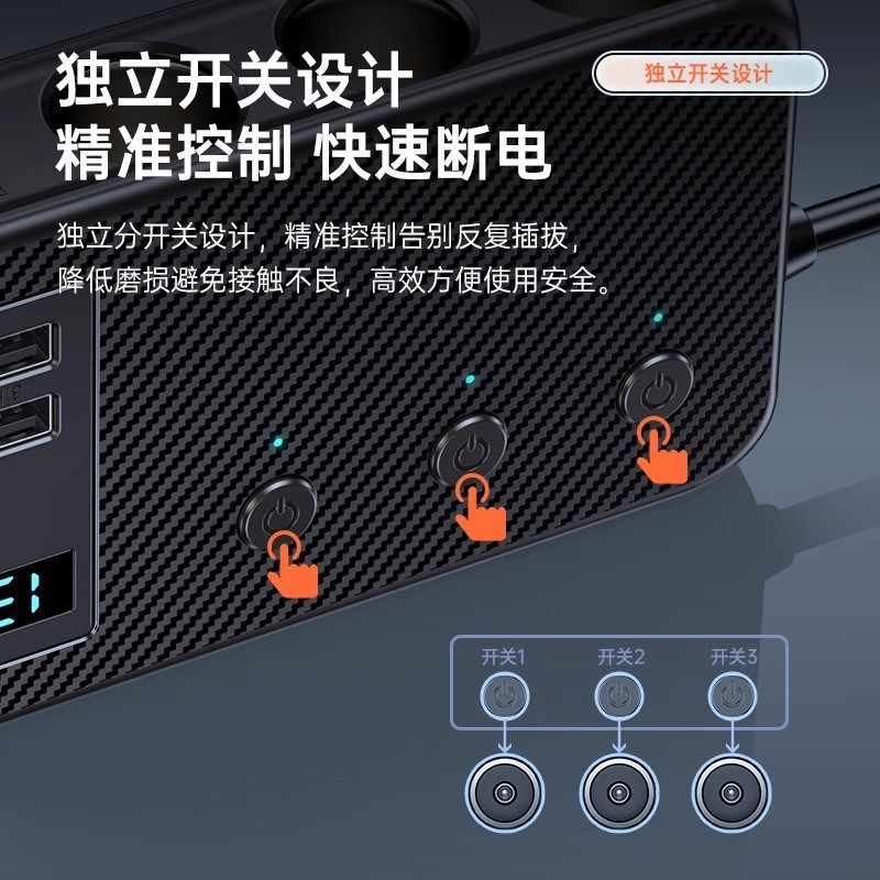 沿途360W超大功率车载充电器一拖二开关数显PD快充通用带加热坐垫