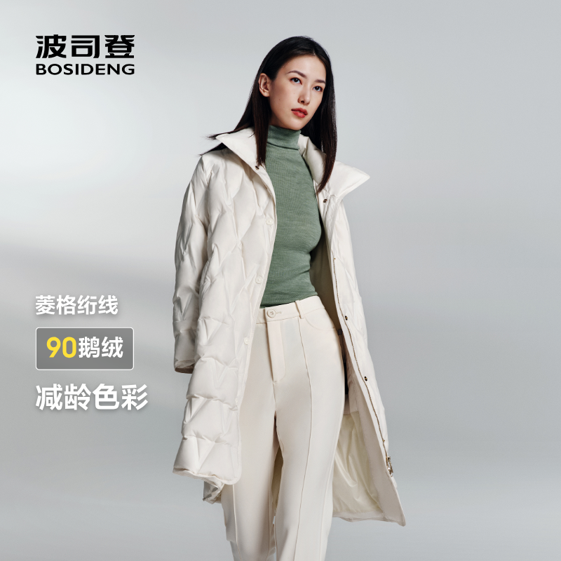 波司登2023女士鹅绒轻薄立领羽绒服宽松廓形中长款外套B30134162
