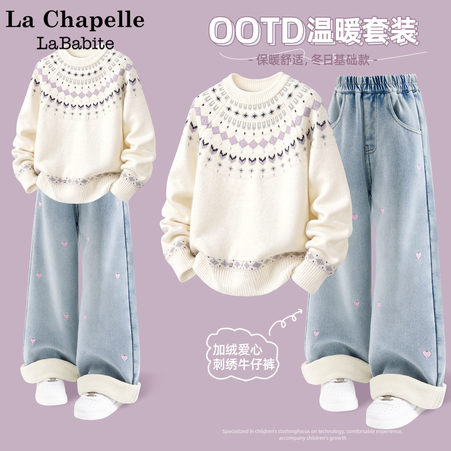 拉夏贝尔女童冬套装2026新款费尔岛毛衣加绒牛仔裤儿童冬装两件套