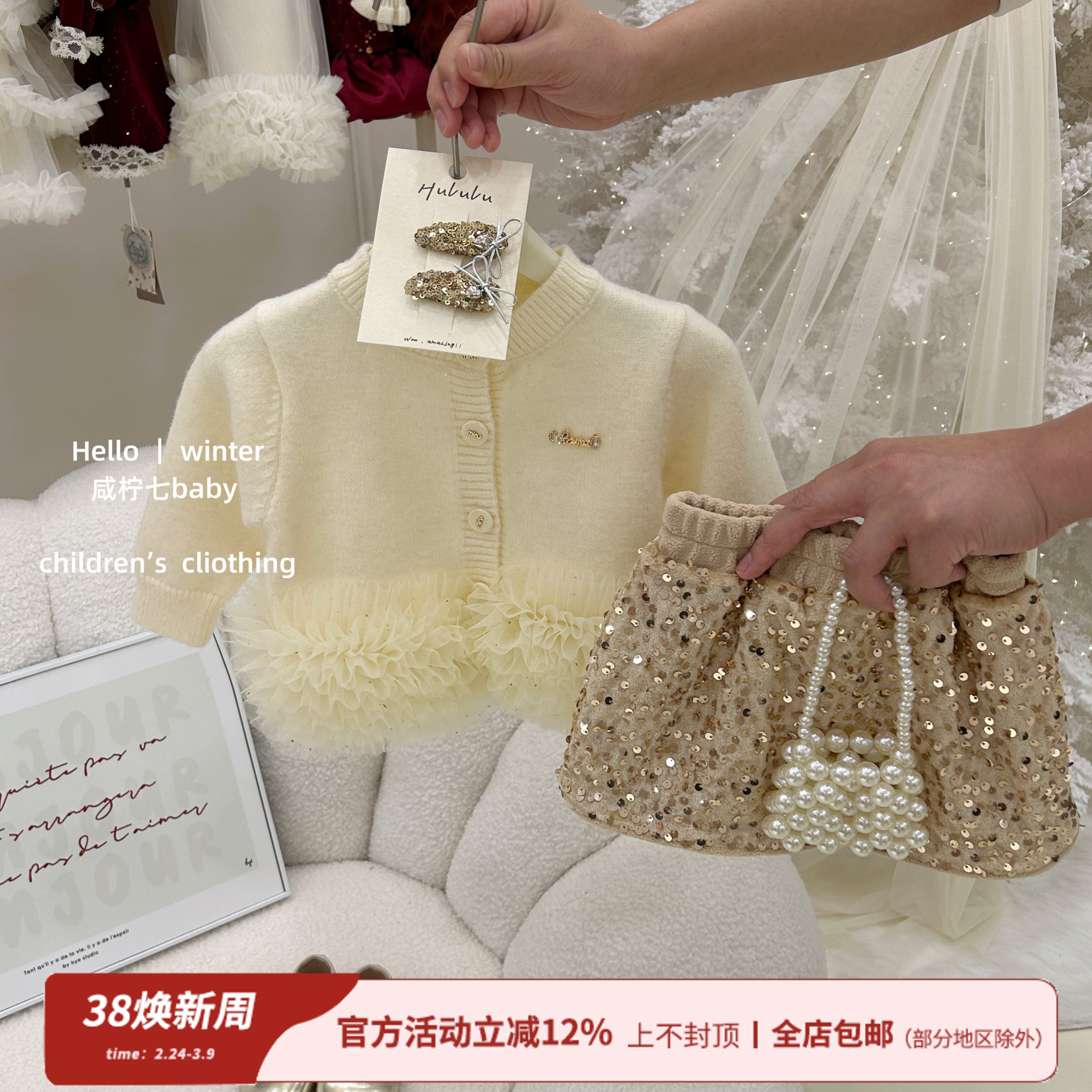 【咸柠七】鎏金!女童秋冬套装网纱毛衣开衫外套亮片半身裙两件套