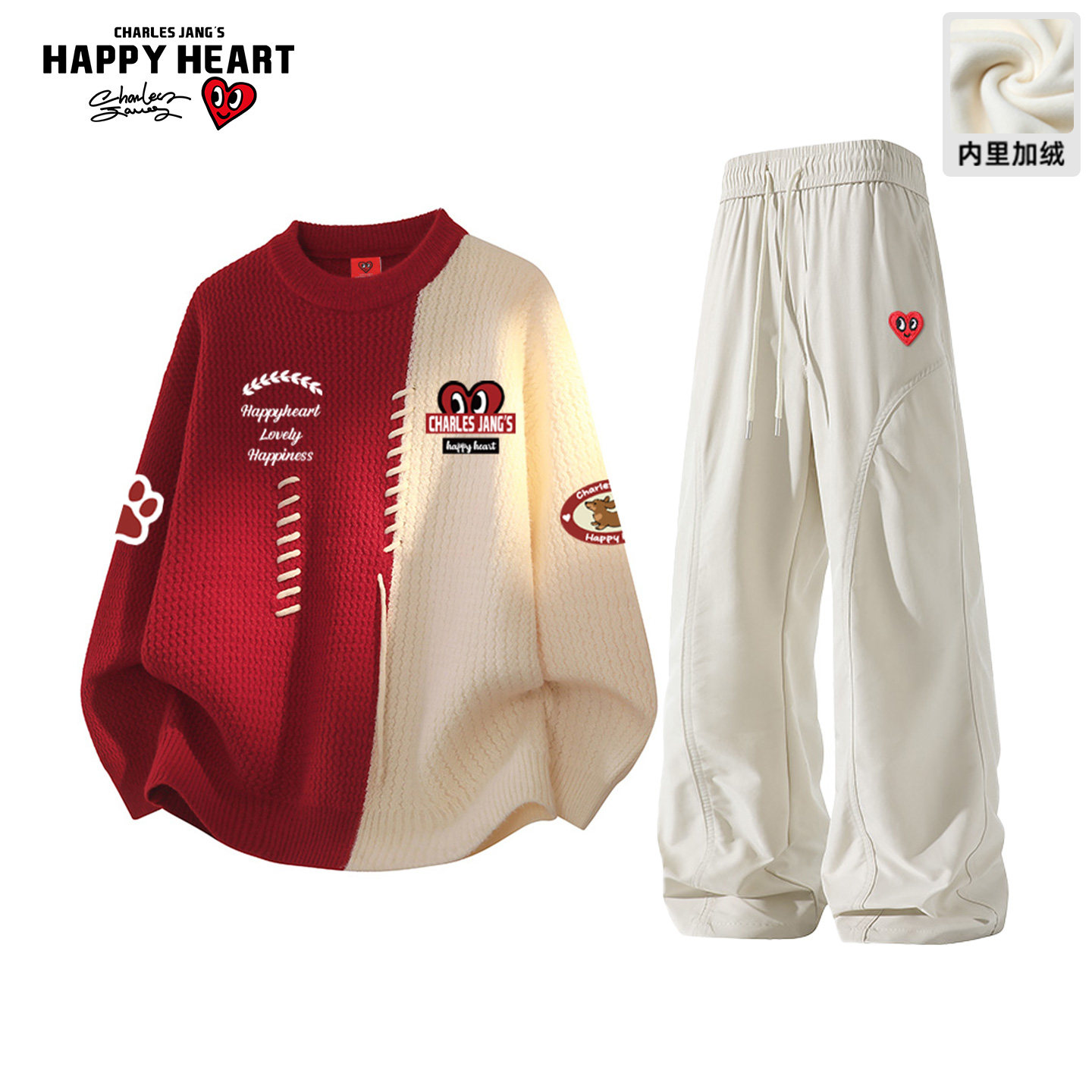 查尔斯桃心休闲套装男女冬季设计感圆领毛衣加绒直筒长裤子两件装