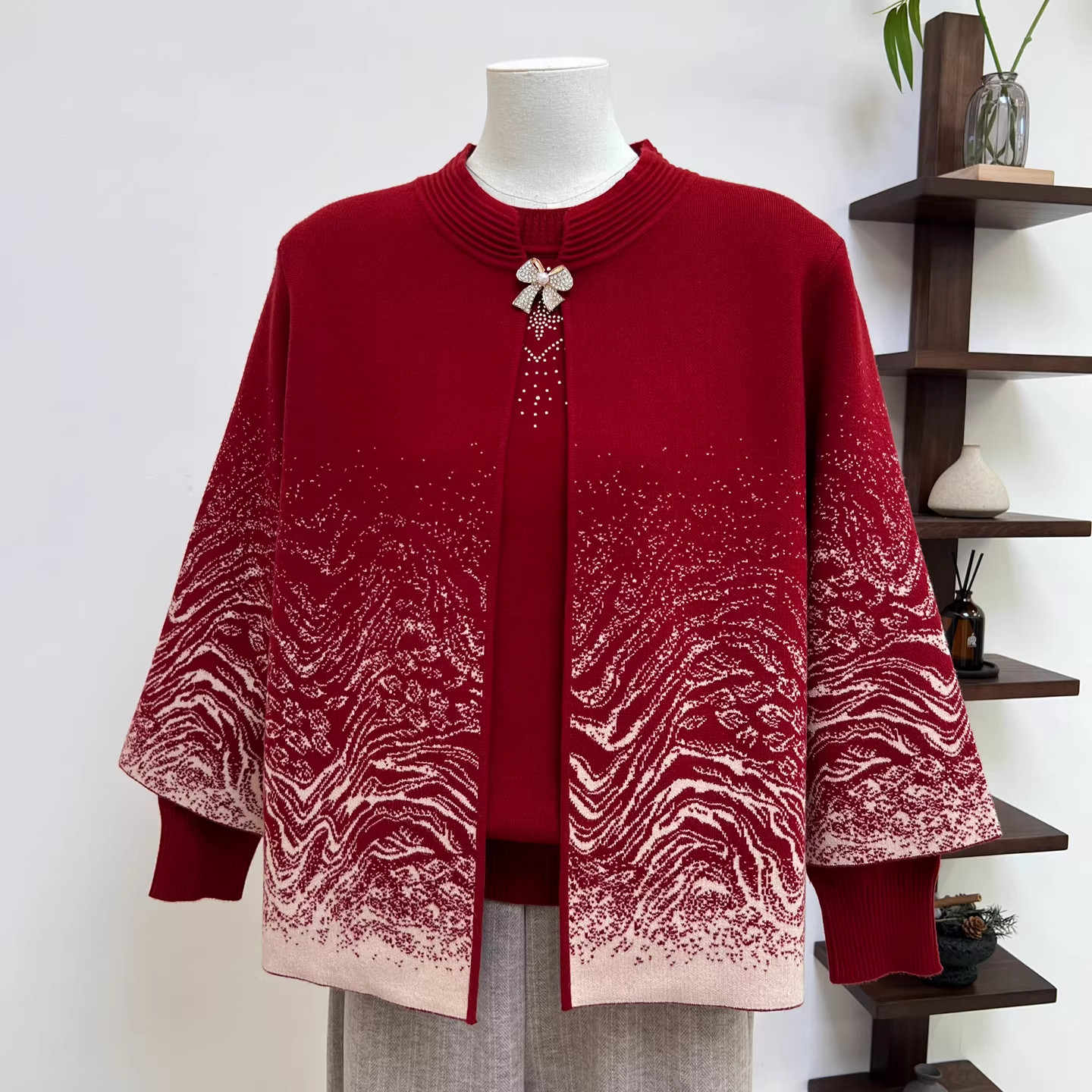 新中式妈妈装秋冬季针织上衣内搭外套真两件中老年女气质毛衣套装