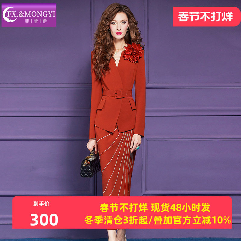菲梦伊高级感西装套装女秋季立体花朵装饰西服上衣半身裙子职业装