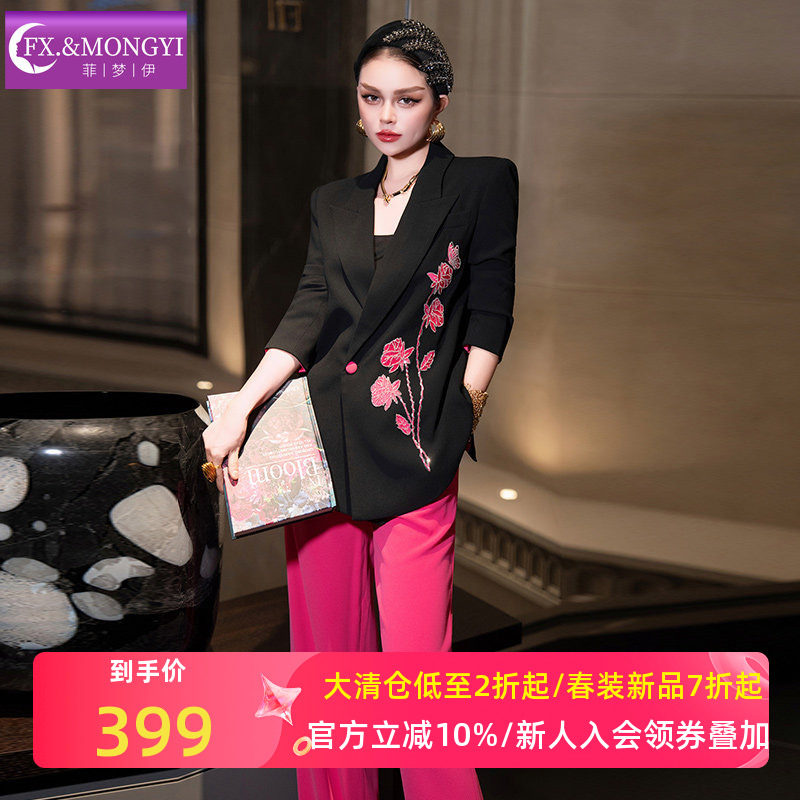 菲梦伊新中式绣花西装套装女秋季通勤时尚气质黑色西服职业长裤子