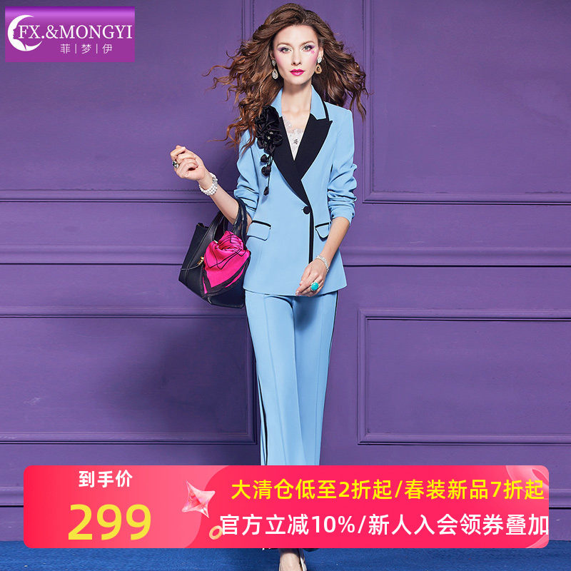 菲梦伊蓝色西装套装女秋季时尚通勤简约气质职业西服休闲裤两件套