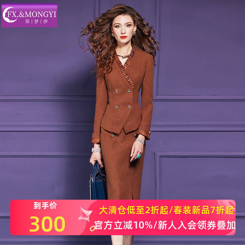 菲梦伊含羊毛西装套装女秋季木耳边复古加厚毛呢外套职业开叉半裙