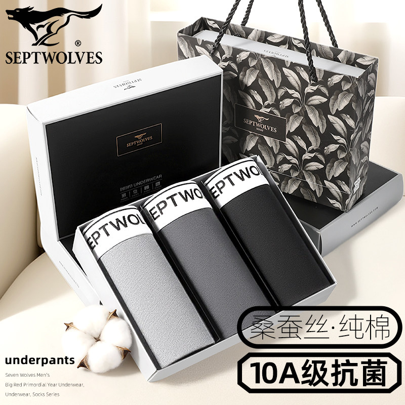 七匹狼高端桑蚕丝内裤男款纯棉四角裤10A抗菌平角裤高弹打底裤3条