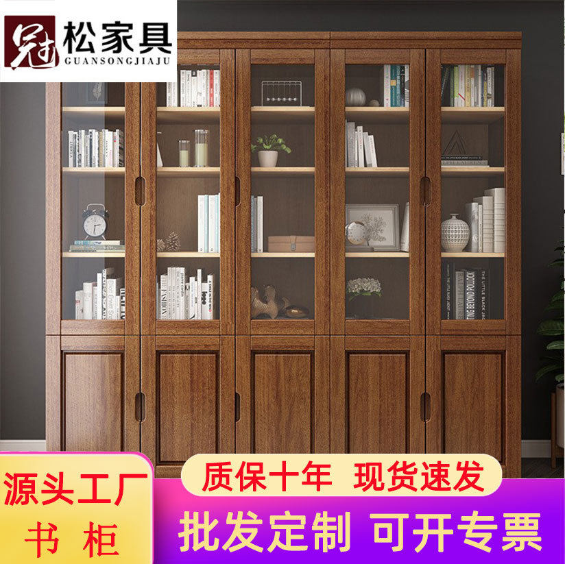 实木书柜书架带玻璃门落地置物柜家用组合多层书橱定制收纳展示柜